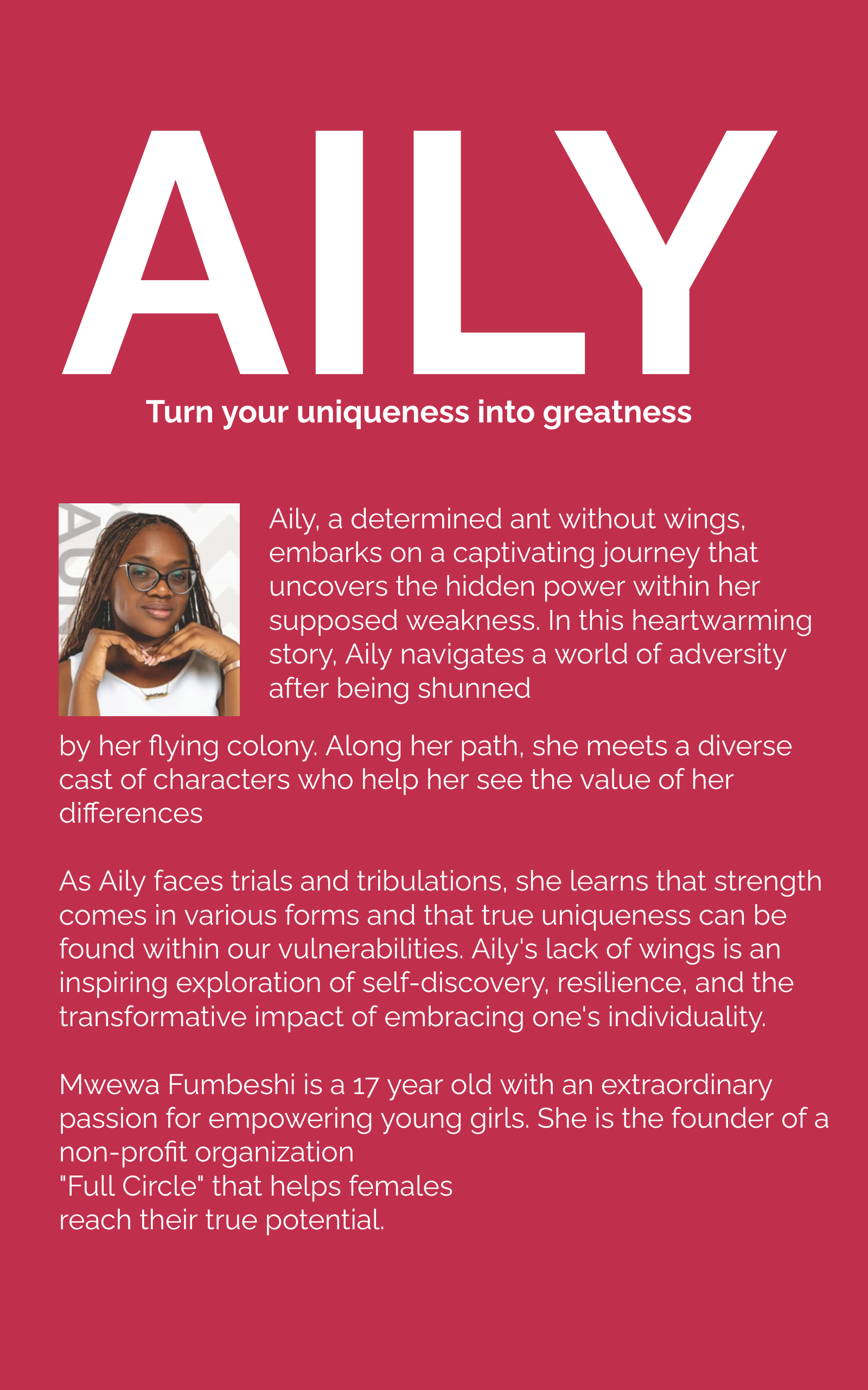 Aily is Mwewa’s first book. Growing up, she was bullied for reading and writing and wanted to find a book that could help her through her life. After finding no book that related to her, she decided to write ‘Aily: Turn your uniqueness into greatness’ to share what she learned with others. Ail’s story is inspiring and will help you turn your uniqueness into greatness.